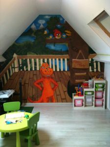Une salle de jeu aménagée pour leurs enfants, ces parents ont fait appel à R2Déco pour venir donner de la vie au mur du fond.