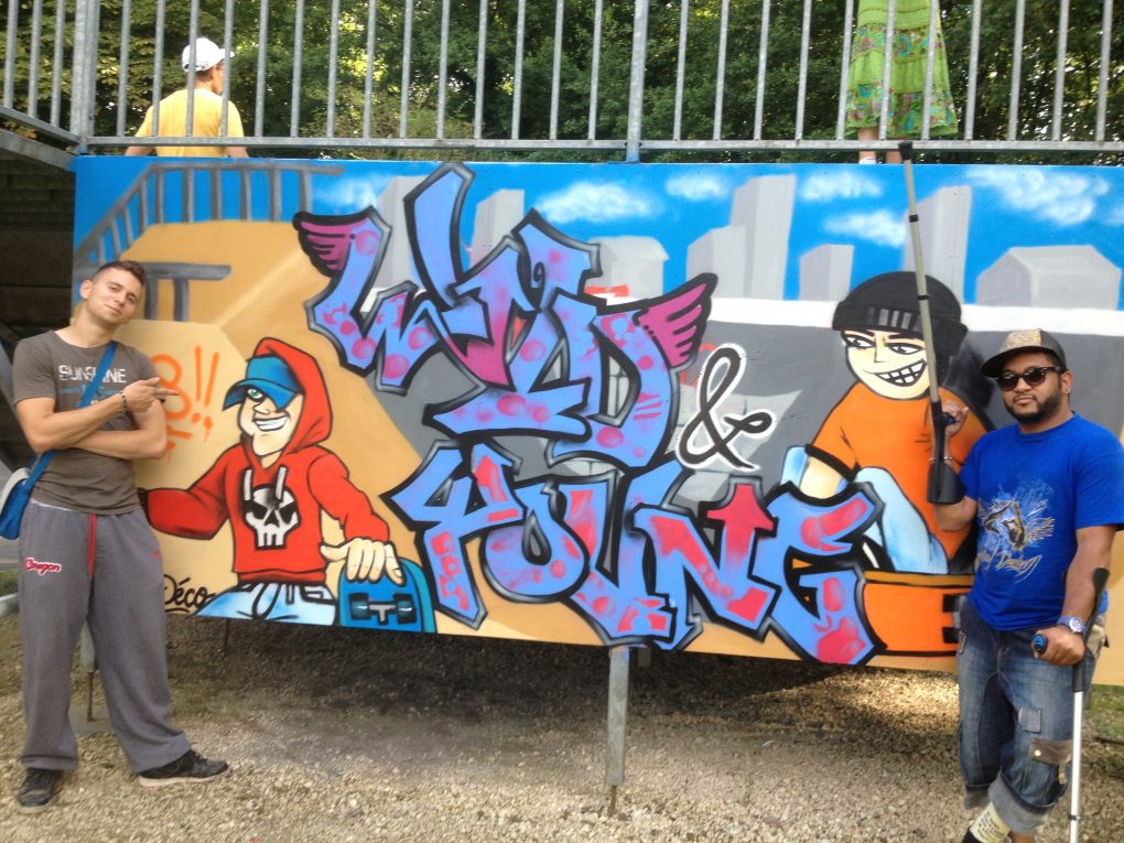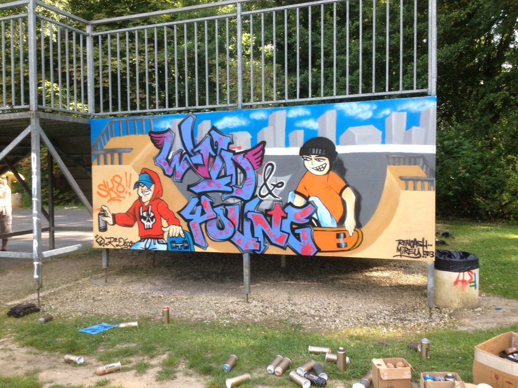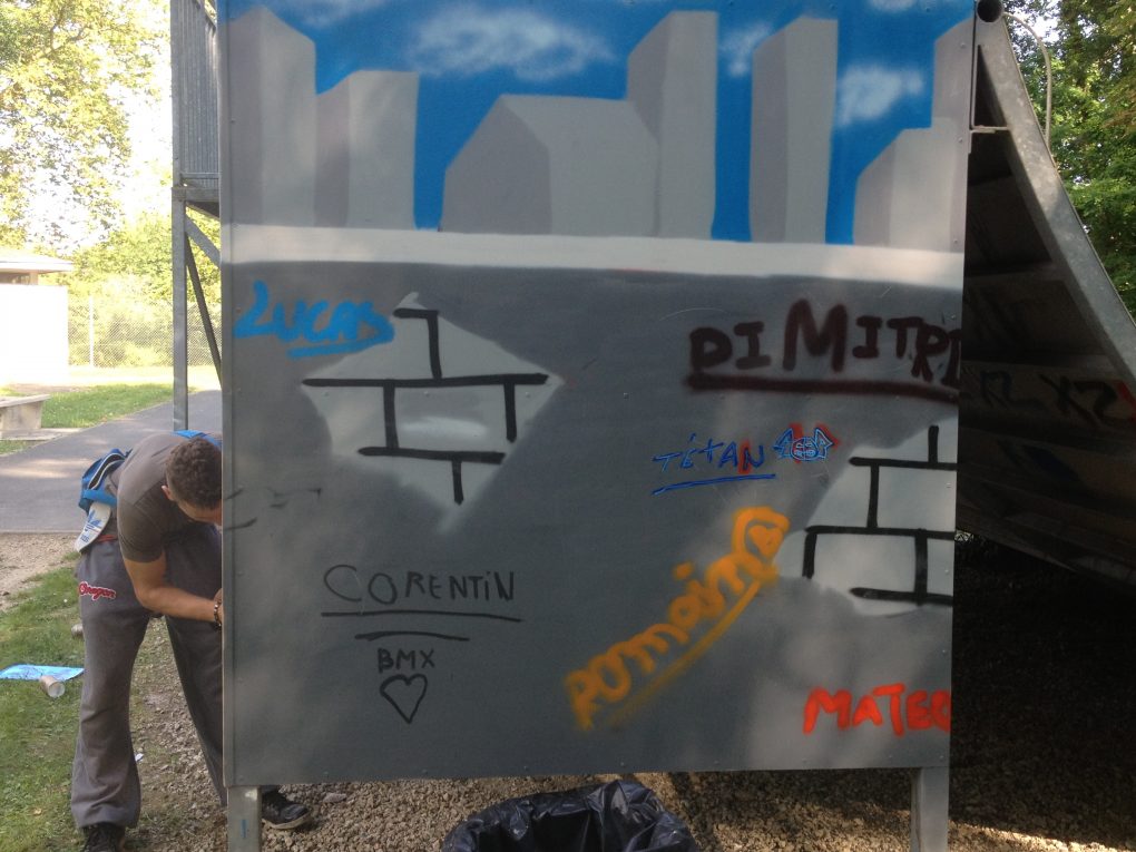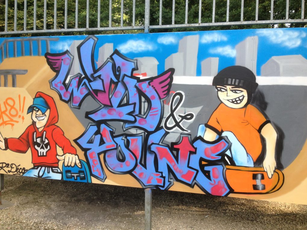 La rénovation du Skatepark de Malesherbes était une action du conseil municipal des jeunes de la ville. En collaboration avec R2 Déco, les jeunes ont organisé un atelier participatif où tout le monde pouvait participer. Le fond et les personnages ont ainsi été réalisés lors d’une séance épique où la pluie avait un peu gâché l’évènement, mais l’équipe a pu finir le projet par la suite pour un habillage du plus bel effet! Découvrez le projet ci-dessous :