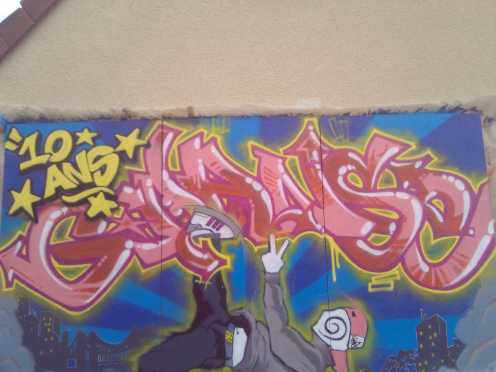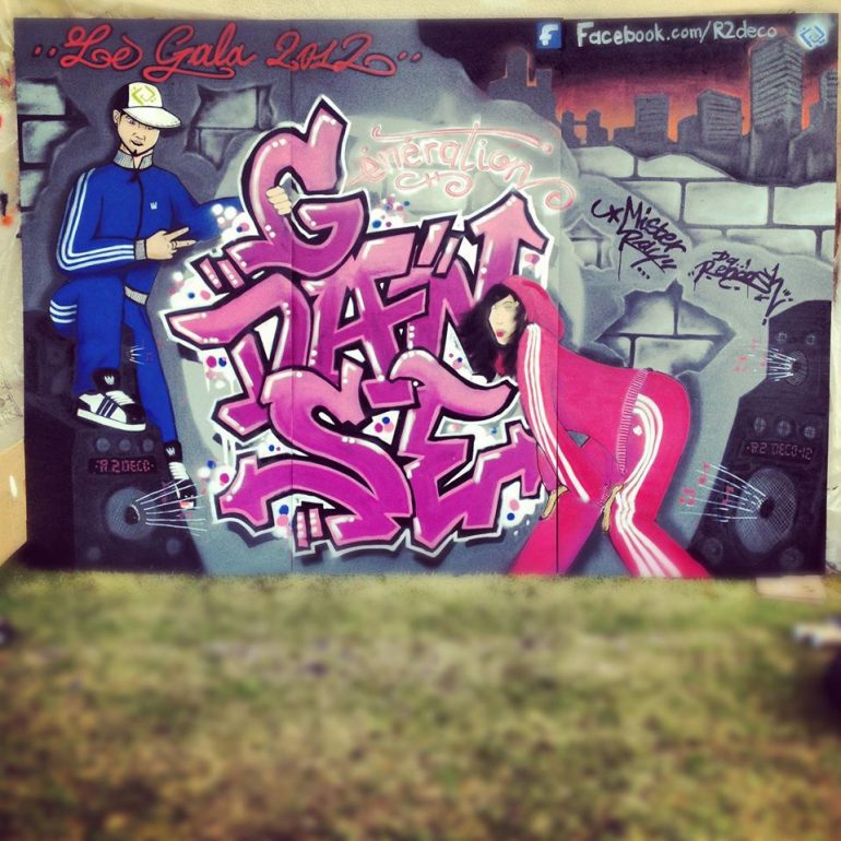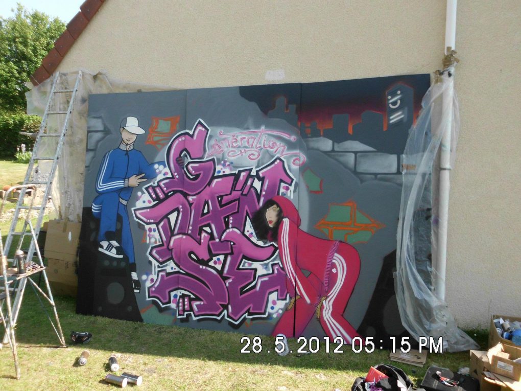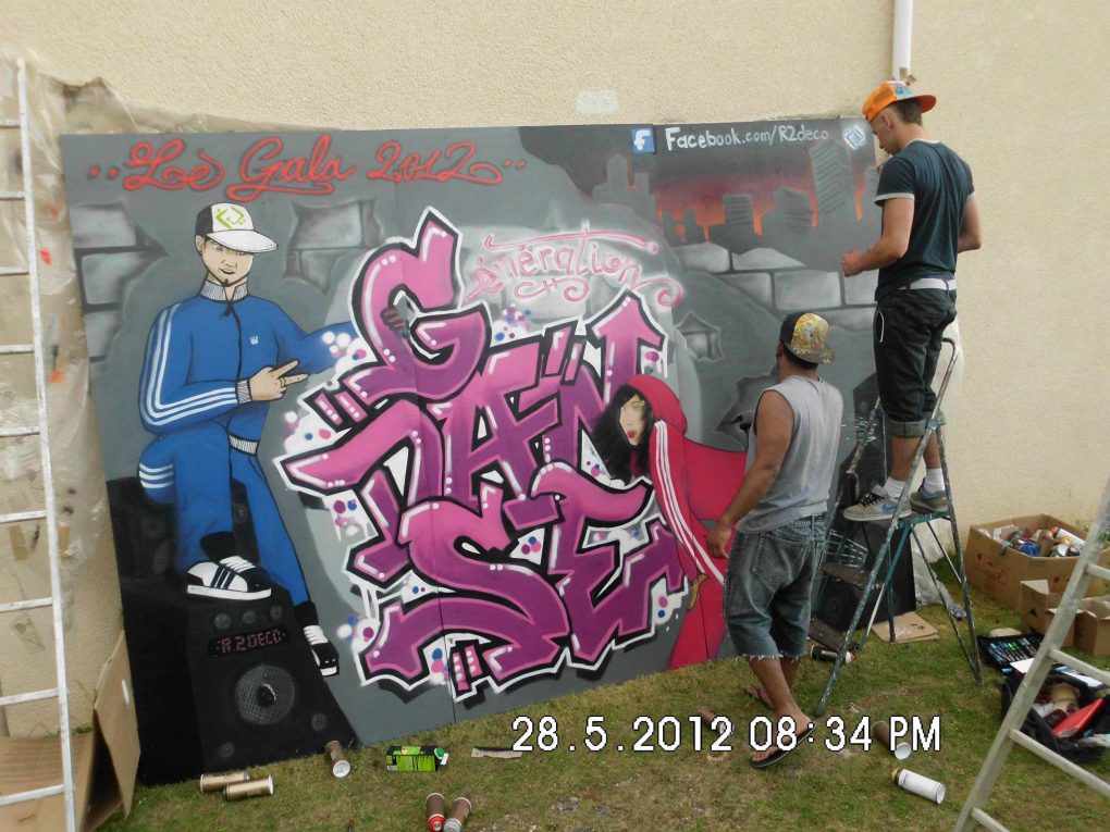 Plusieurs années durant R2Déco a réalisé un fond de scène pour l’association Génération Danse. Généralement un lettrage avec le nom de l’association dans un décors urbain souvent agrémenté d’un personnage, c’est avec grand plaisir que nous avons toujours collaboré avec Sylvie pour offrir un fond de scène dynamique à ses galas de fin d’année!