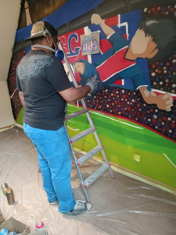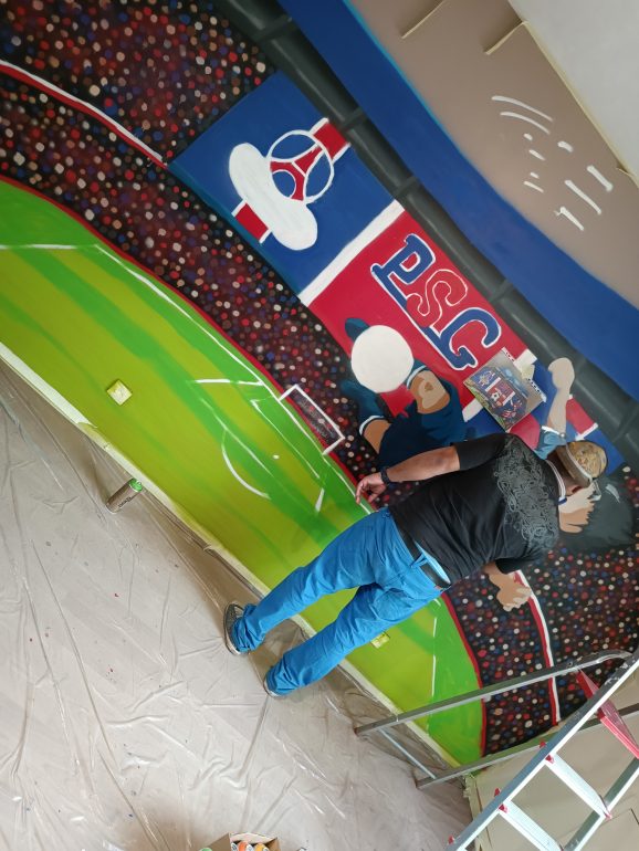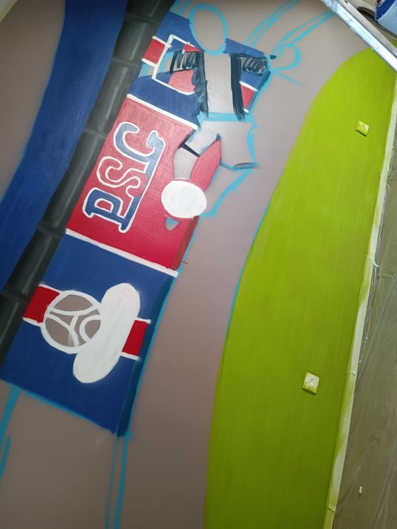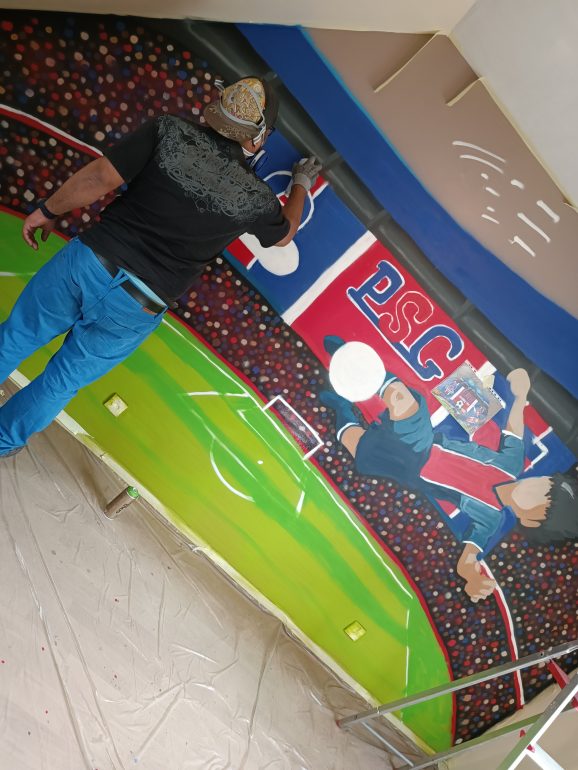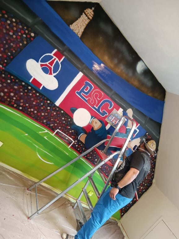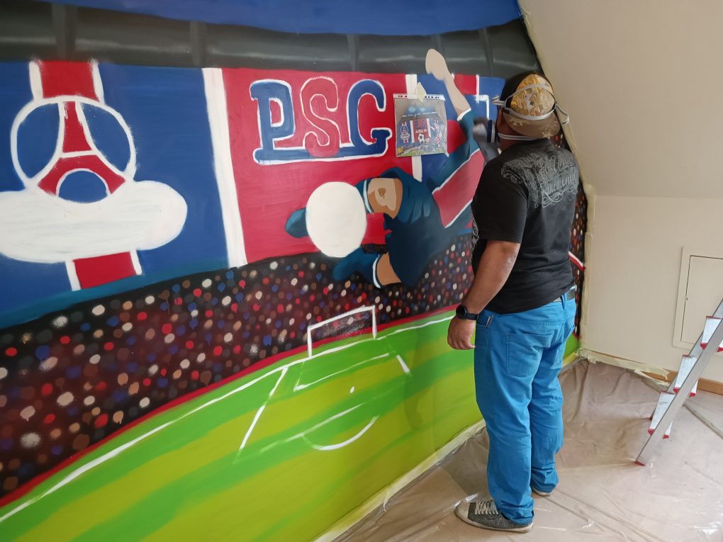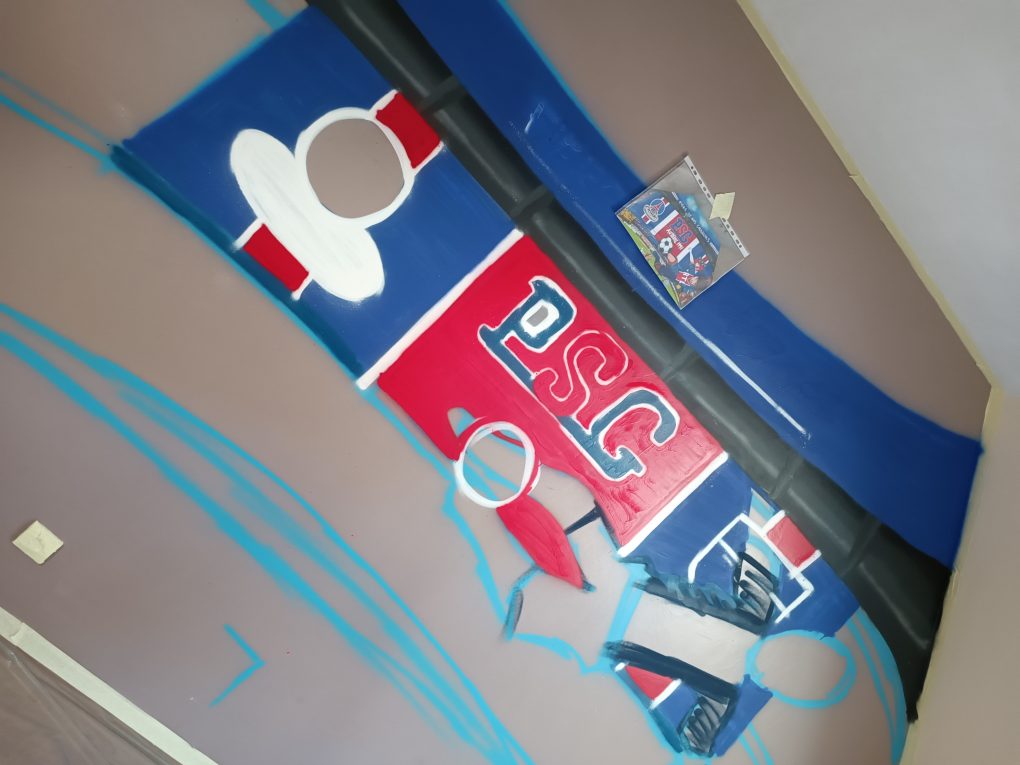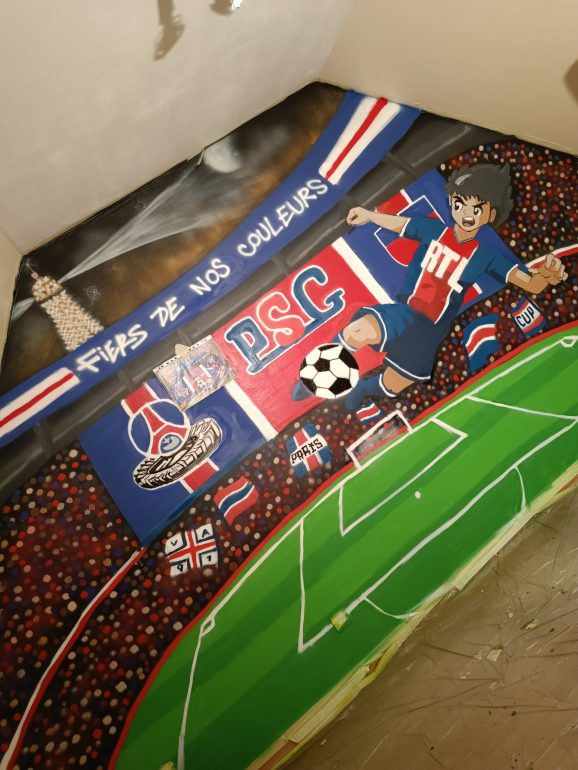 Grands Supporters du PSG, Laurent et Anna Maria souhaitaient faire une surprise à leurs enfants en décorant leurs chambres aux couleurs de leur équipe favorite et de leur manga préféré! La chambre de Yannick sera sur le thème d’Olive & Tom sur fond de Virage Auteuil, l’emplacement des ultras du PSG au Parc des Princes. Découvrez le projet en image :